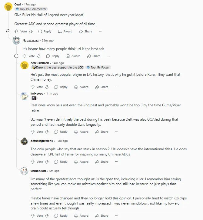 我记得很多最伟大的ADC都认为Uzi也是GOAT,包括Ruler。我记得他说过类似“即使你没有任何失误,也可能会输给他,因为他打得太完美了”。